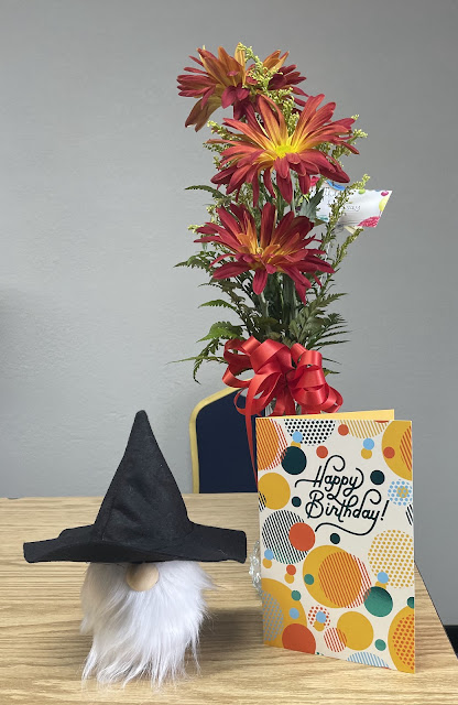 My very sweet Tuesday WW group gave me flowers and my brother made the cute witch gnome filled with peanuts and candy corn. I don’t like candy corn but that combo is epic!